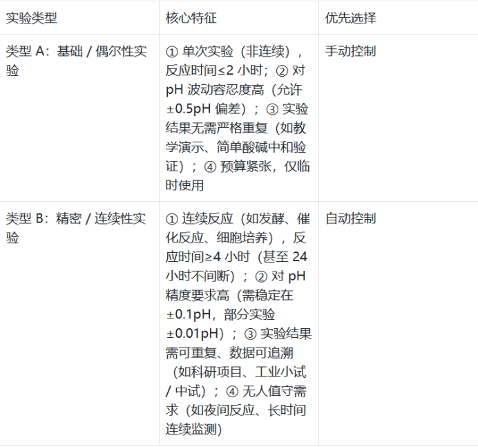 實驗室場景的核心訴求精度要求不同(常需 ±0.1pH 甚至 ±0.01pH)、反應連續(xù)性強、數據可追溯,這決定了 “哪種好” 不能一概而論,核心看你的實驗是否滿足以下兩類特征: